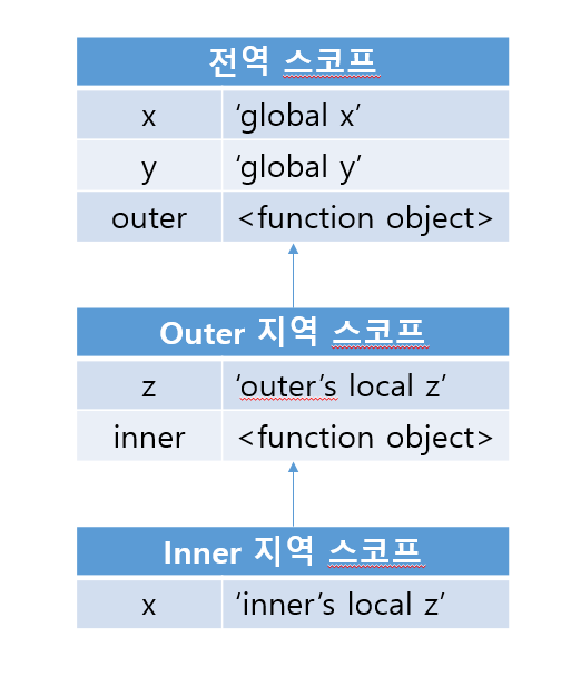 전역 스코프, outer 지역 스코프, inner 지역 스코프. 이러한 계층 구조를 스코프 체인이라고 한다. 변수를 참조할 때 자바스크립트 엔진은 스코프 체인을 통해 변수를 참조하는 코드의 소코프에서 시작하여 상위 스코프 방향으로 이동하며 선언된 변수를 검색한다.