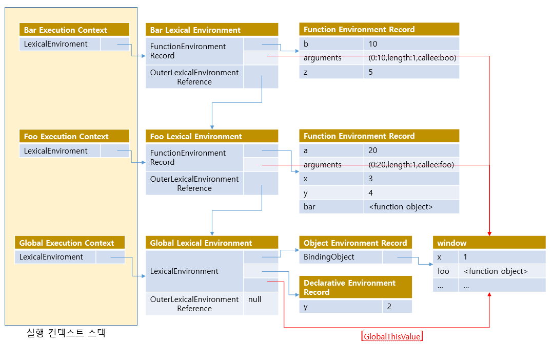 식별자와 스코프는 실행 컨텍스트의 렉시컬 환경으로 관리하고 코드 실행 순서는 실행 컨텍스트