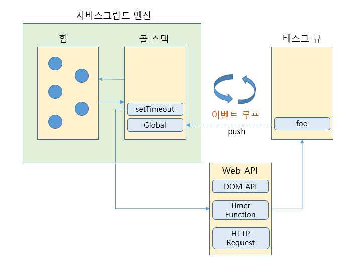 타이머 함수인 setTimeout과 setInterval, HTTP 요청, 이벤트 핸들러는 비동기 처리 방식으로 동작한다. 비동기 처리는 이벤트 루프와 테스크 큐와 깊은 관계가 있다.